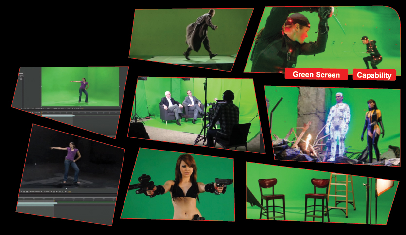 The application of green screen allows actors to be filmed in a green screen studio enviroment and then using computer technology we are able to cut out the actor in the green screen space and then superimposed using computer software the actor, objet or sumbject matter onto different video backgrounds or images.